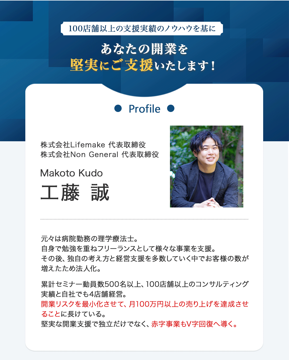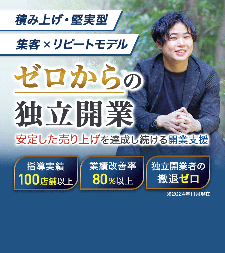 月100万円達成し、スタッフ雇用をできるまで成長しました! 誠さんに2年以上コンサルティングをお願いしており、副業から独立して月100万円を達成してスタッフを雇用できるまでになりました。 開業時は数字を曖昧に管理していてフワッとしている状態でしたが、今では自分でも考えながら数字を正確に管理して仮説を立て経営ができるようになっています! 今後、スタッフさんを増やしながら店舗展開をしていくために変わらず積み上げていきます。