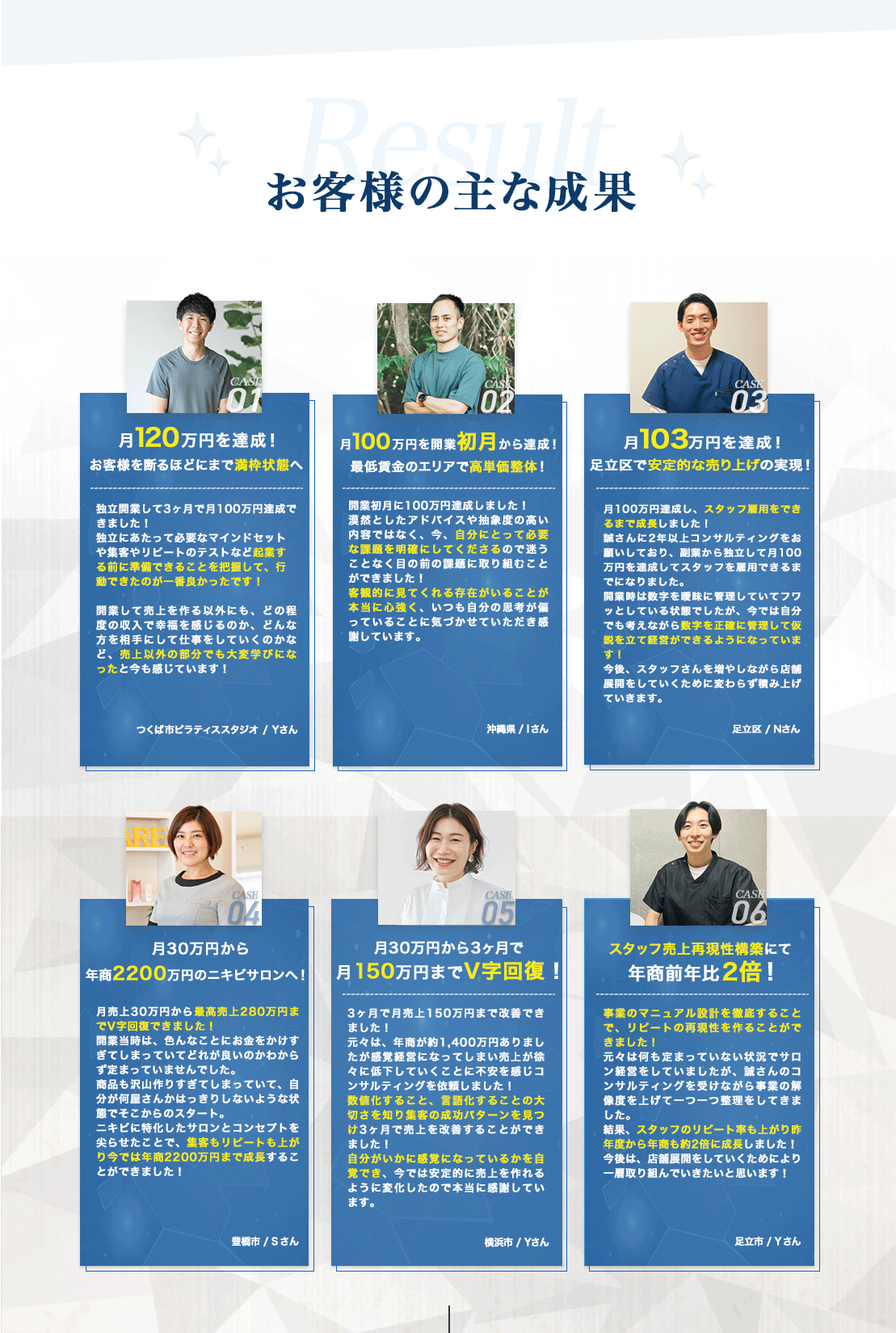 3ヶ月で月売上150万円まで改善できました! 元々は、年商が約1,400万円ありましたが感覚経営になってしまい売上が徐々に低下していくことに不安を感じコンサルティングを依頼しました! 数値化すること、言語化することの大切さを知り集客の成功パターンを見つけ3ヶ月で売上を改善することができました! 自分がいかに感覚になっているかを自覚でき、今では安定的に売上を作れるように変化したので本当に感謝しています。
